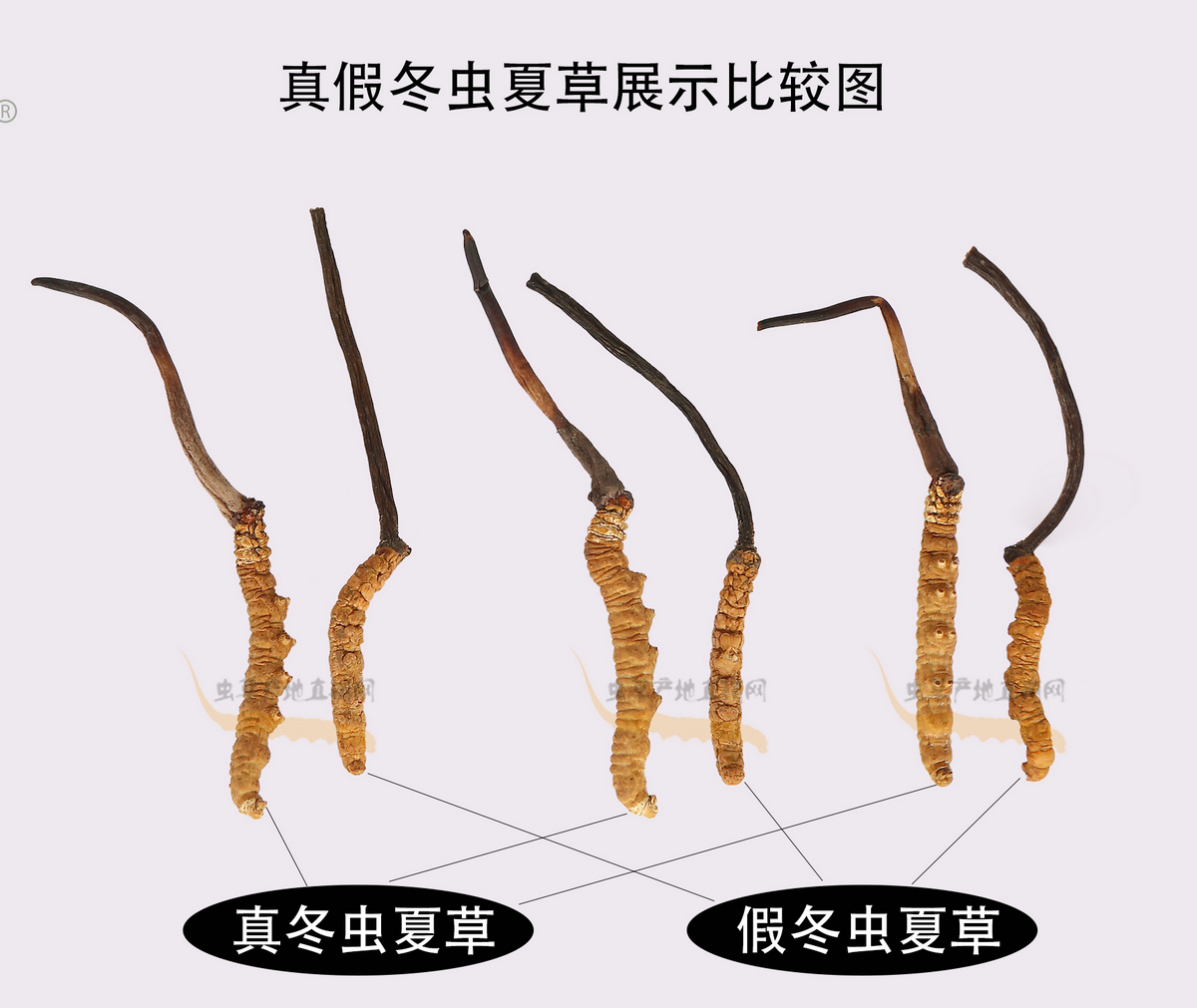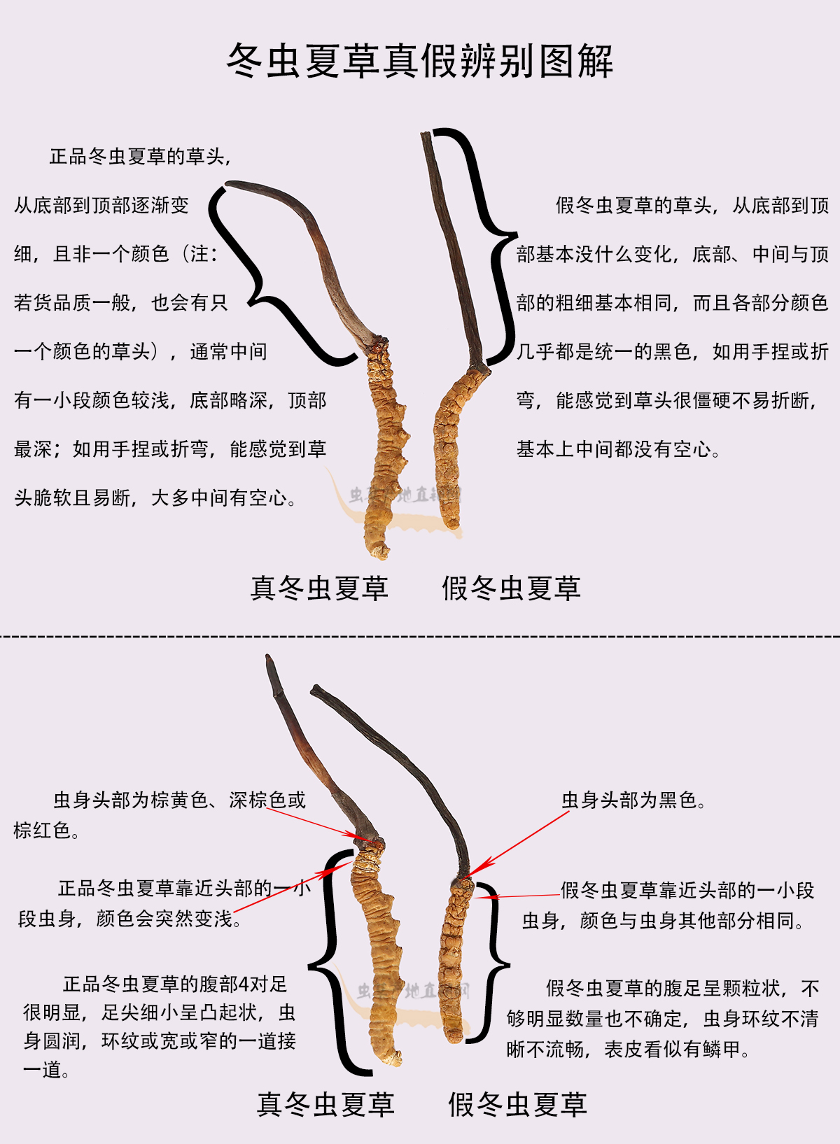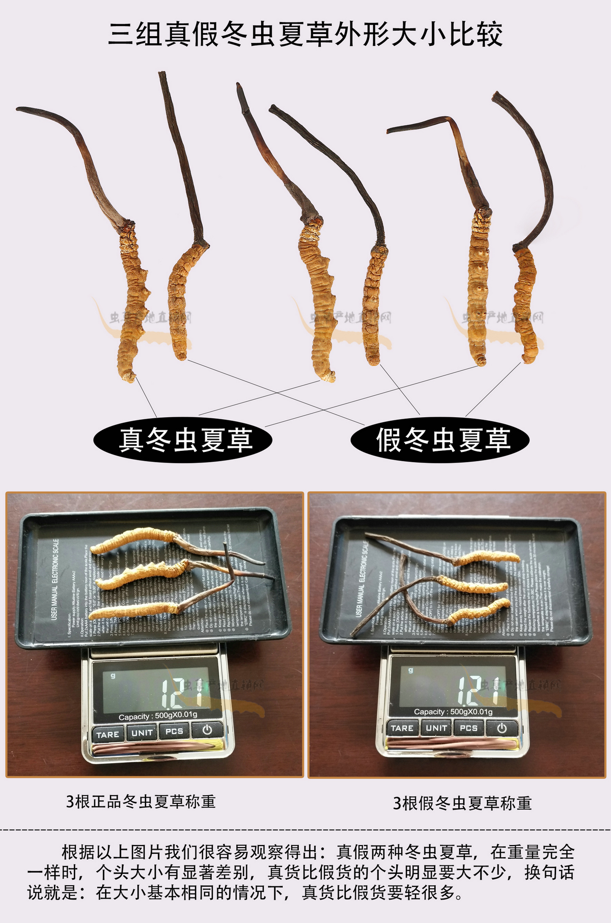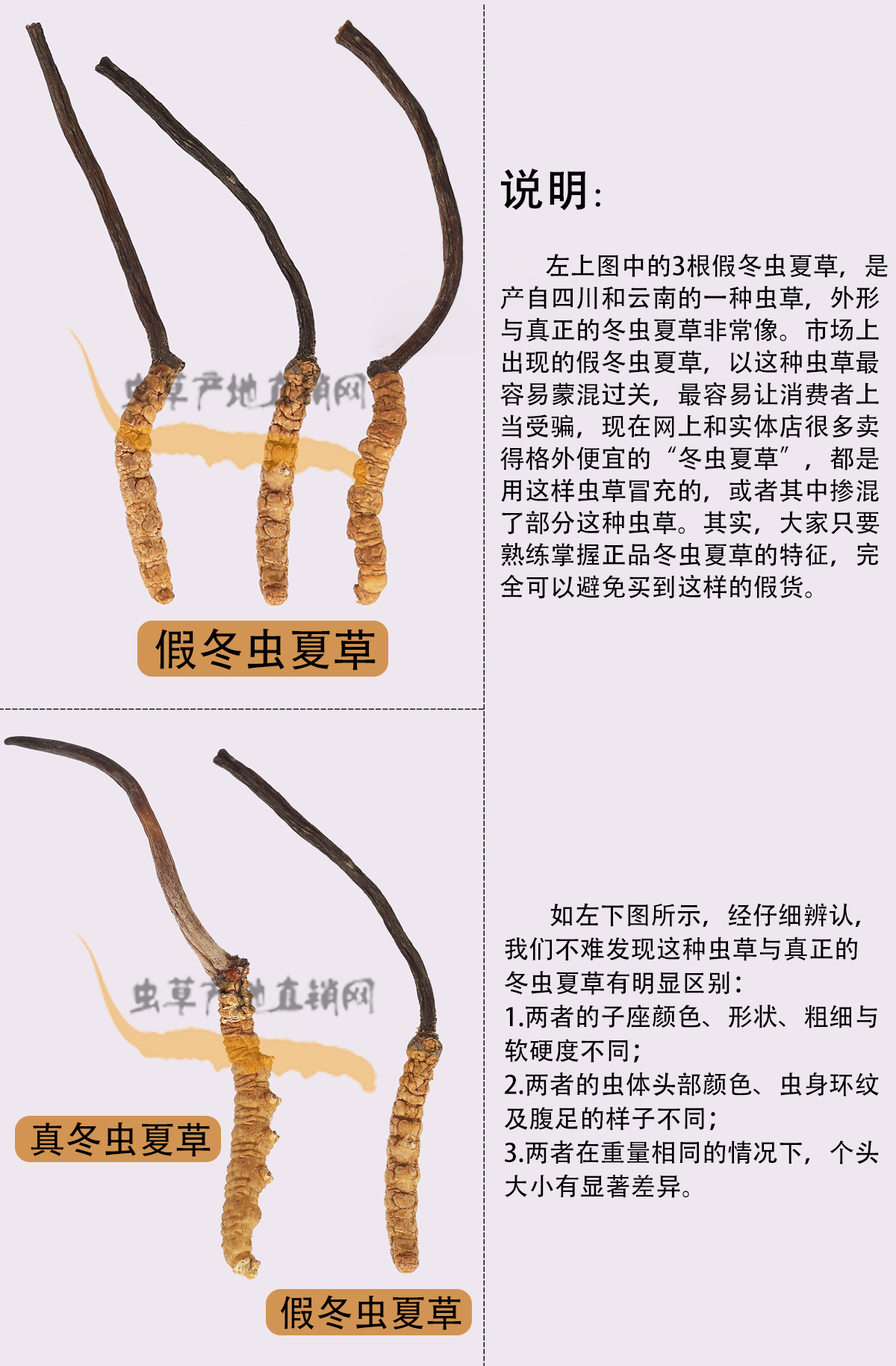 以上圖片,將這種產(chǎn)自四川和云南、極易被不法商家用來(lái)冒充正品的假冬蟲(chóng)夏草與真冬蟲(chóng)夏草的外形特征區(qū)別,介紹得非常清楚,相信大家在認(rèn)真看過(guò)之后,就能避免買到這種假蟲(chóng)草了。